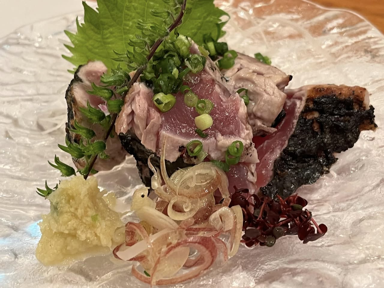鰹の叩き、鯨の白ベーコン、ギョウジャニンニクの天麩羅、